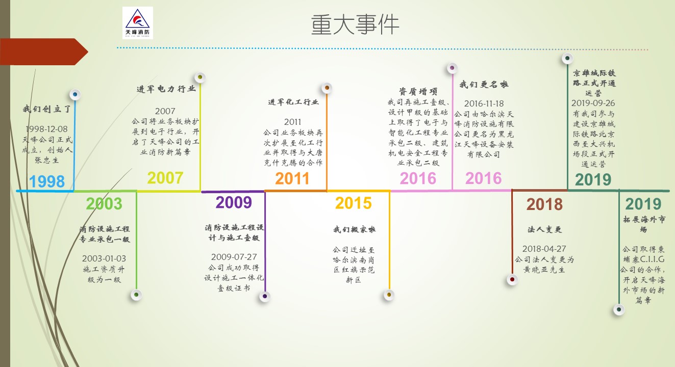 黑龍江天峰設備安裝有限公司(以下簡稱:天峰消防)創(chuàng)立于1998年,主要承接能源化工、石化、電力、軌道交通、冶金、城市管廊等工業(yè)行業(yè)消防系統(tǒng)工程,可為客戶提供特殊消防系統(tǒng)的詳細設計、供貨、施工等集成服務,天峰消防將依靠自身實力和信譽實現(xiàn)“立足龍江,布局全國,走向海外”的目標。